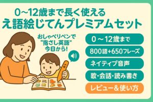 | 目的/年齢 | 小学えいご絵じてん800(本品) | えいご絵じてんプレミアム(0–12歳) | Super Simple Songs Vol.1 | Goomies English for Kids |